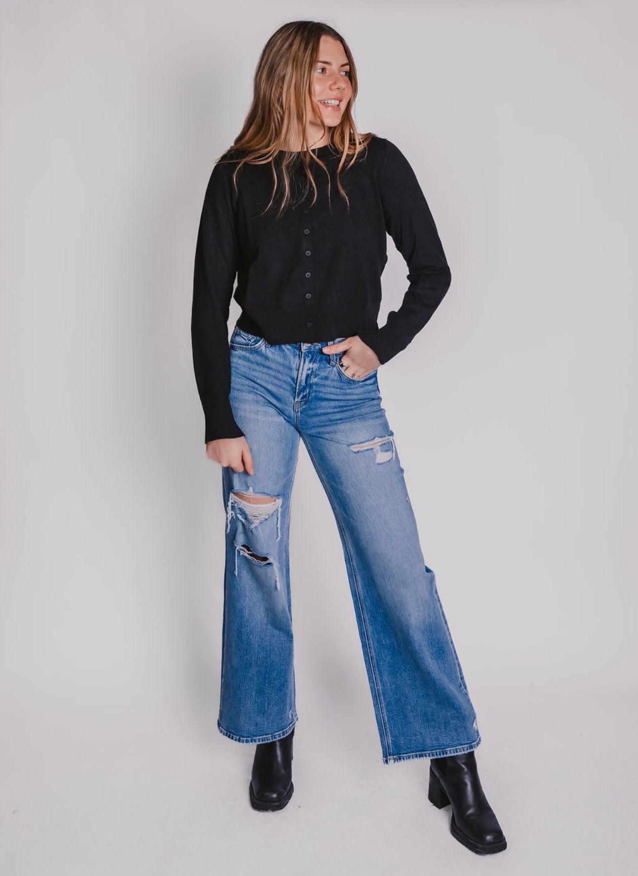The Basic Button Up Cardigan is your go-to layering essential. Crafted from incredibly soft material, this versatile piece works perfectly worn buttoned up for a polished look or left open as a relaxed layer. The true-to-size fit means no guessing—just grab your usual size and you're set. Whether you're dressing it up or keeping it casual, this timeless black cardigan adapts to whatever your day calls for.