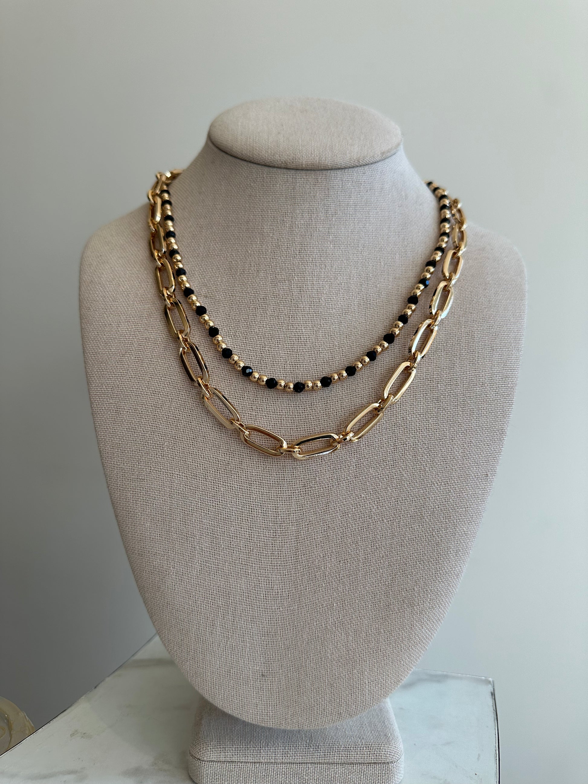 Effortless elegance meets everyday wear with this layered necklace. The delicate black beaded strand pairs beautifully with a chunky gold chain, creating dimension and visual interest. Whether you're dressing up or keeping it casual, this versatile piece works as your go-to staple—wear it solo or layer it with other favorites for a personalized look.