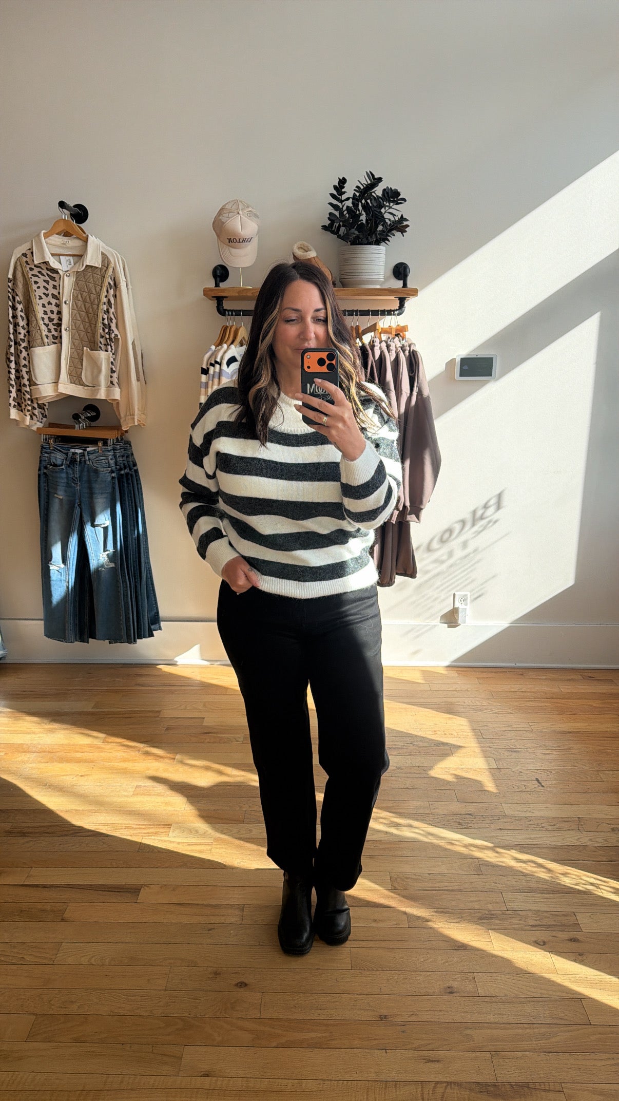 Layer effortlessly with The Striped Sienna Knit Sweater, featuring an integrated inner tank that eliminates the need for extra pieces. This fuzzy knit combines white and charcoal stripes in a buttery-soft material that feels like a warm hug. Perfect for transitional weather, the built-in tank keeps you comfortable while the cozy texture adds instant comfort to your everyday rotation.