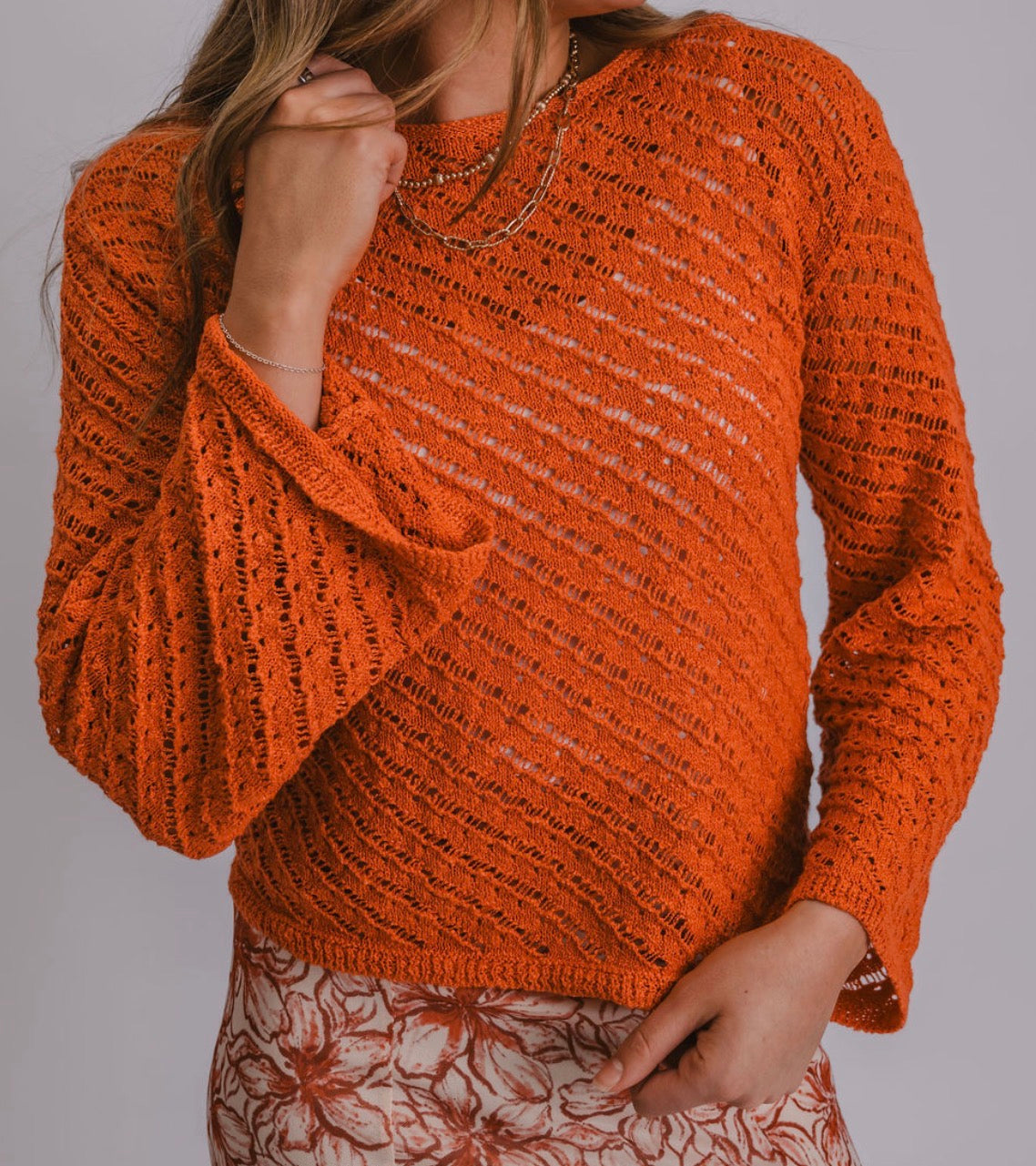 Brighten your wardrobe with this stunning crochet knit sweater in a vibrant orange hue. The lightweight, breathable construction makes it ideal for layering through spring and summer. Style it effortlessly with jeans for a casual look, pair it with shorts for warm-weather days, or dress it up with our floral flowy skirt for a more polished ensemble. Versatile, comfortable, and undeniably gorgeous—this sweater is your go-to piece for the season ahead.