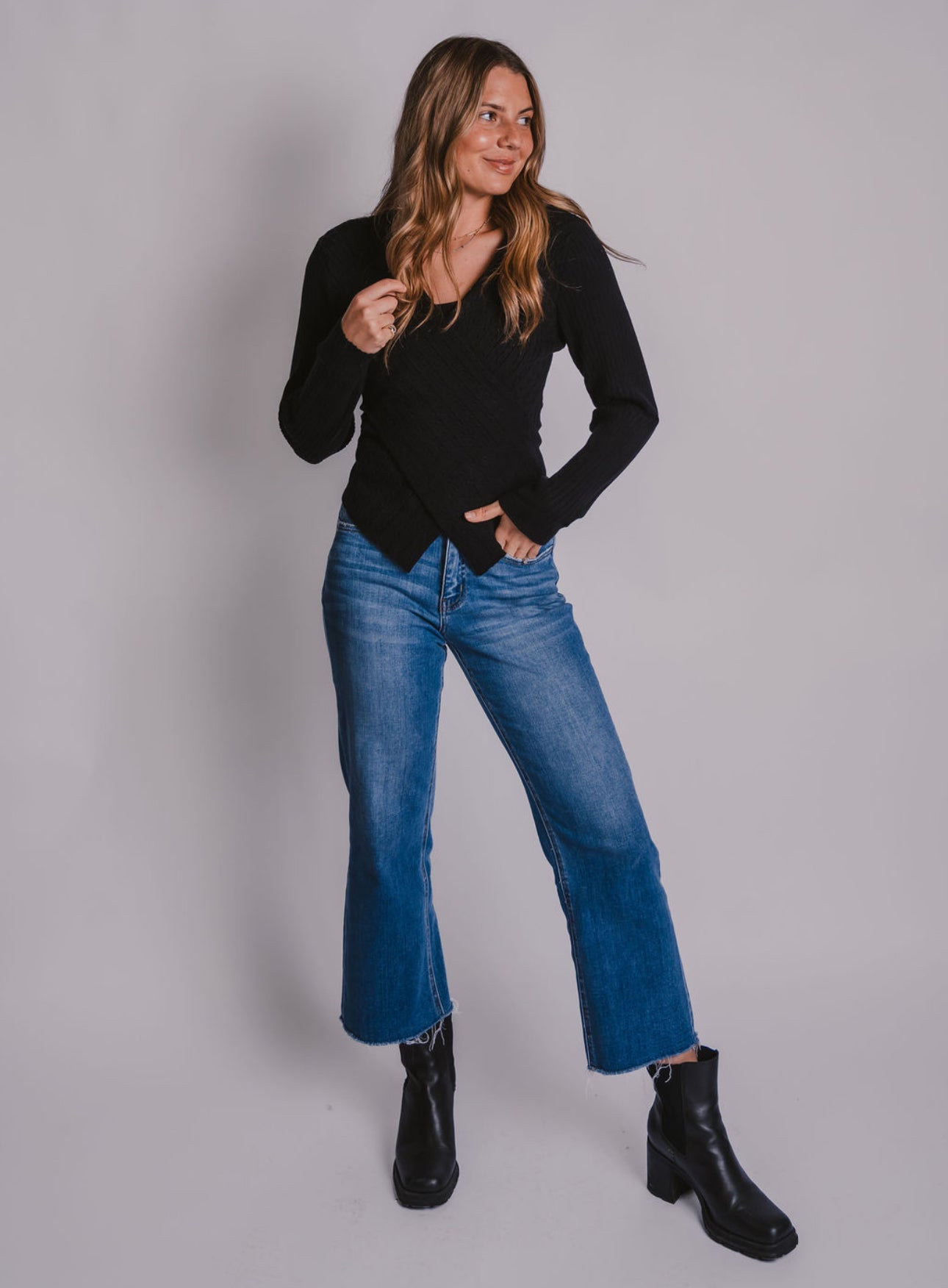 The V-Neck Wrapped Knit Sweater is your new go-to for effortless charm. Its fitted silhouette hugs just right, while the playful V-neck wrap adds a flirty touch. Crafted with a beautiful knit pattern, this sweater blends cozy comfort and classic style—perfect for turning heads with a wink wherever you go.